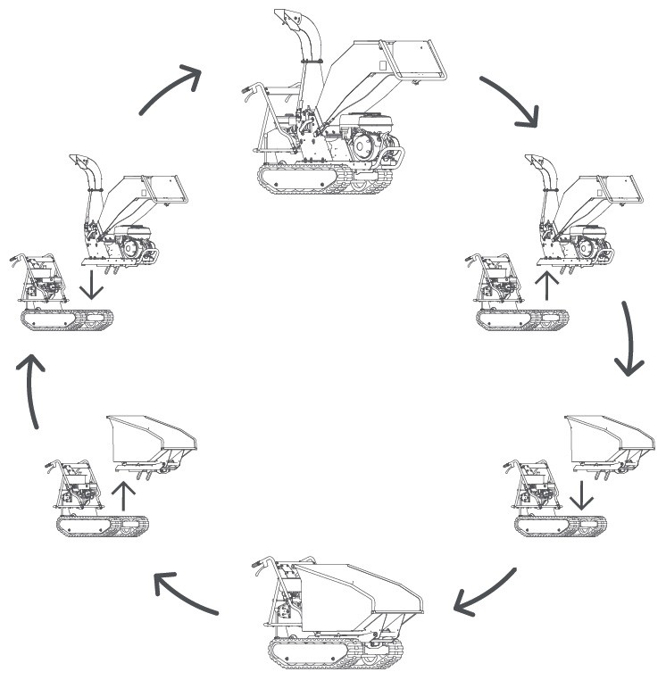 Na deze voorbereiding is het wisselen tussen de houtversnipperaar en dumper op het rupsonderstel zeer eenvoudig. Daar is slechts een hijswerktuig en sleutel 17 voor nodig.